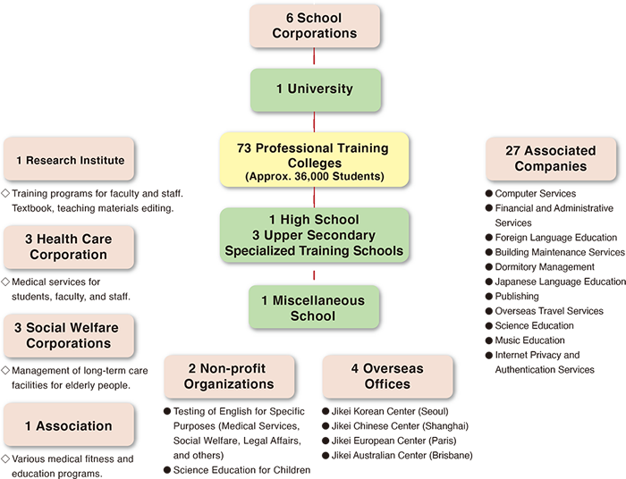 The Jikei Group of Colleges is a system of private professional training colleges and support companies located throughout Japan. Each and every school, company, and organization within the Jikei Group is dedicated to providing professional education based on the strong belief that professional training colleges are educational institutions for mastering the practical skills and knowledge that will most benefit society. To that end, we offer professional education in 10 fields and 600 careers spanning a diverse array of fields, including health care, creative arts, performing arts, ecology, biotechnology and many others and currently provide career-oriented professional education.