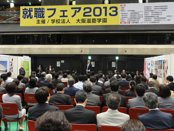The 2013 Osaka Jikei Career Fair for students seeking careers in the health care and social welfare industries at hospitals, social welfare facilities, and related organizations was held at Osaka-Jo Hall in Chuo ward on Monday, May 13.