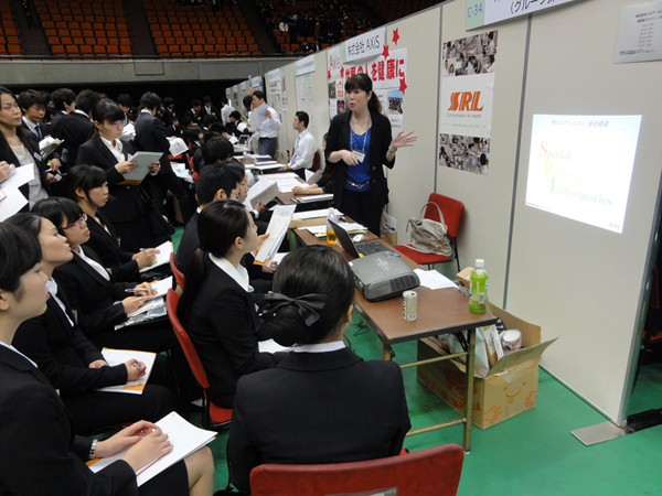 The 2013 Osaka Jikei Career Fair. The fair celebrated its 9th year, welcoming a record number of over 200 employers including hospitals, social welfare facilities,and research organizations and approximately 3500 student participants.Employers use projectors, iPads, and other devices to make their presentations stand out.