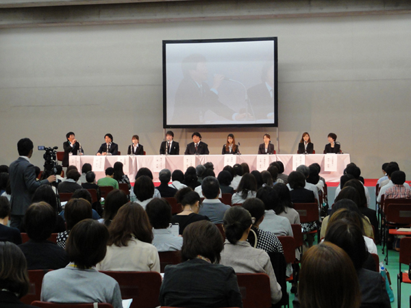Later a graduate of the Osaka Jikei Gakuen School Corporation then took the podium and then a round-table discussion was held, chaired by Mr. Nakamichi, head of the teaching department at Osaka College of Medical Technology. Participants discussed topics such as personal job hunting experiences, the kinds of professionals hospitals are seeking, and whether students can make better use of what they learn at school.
