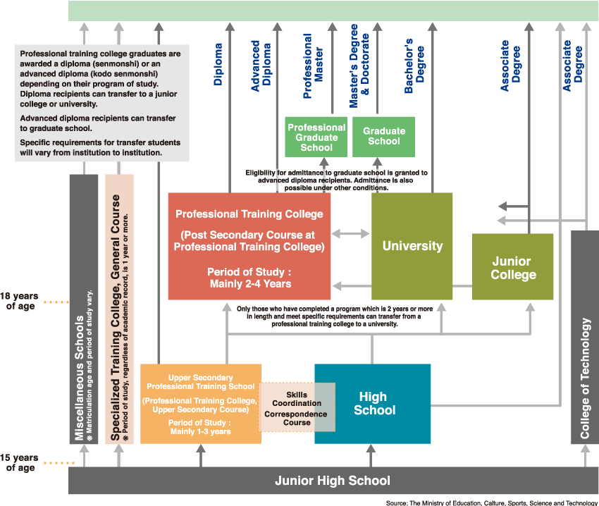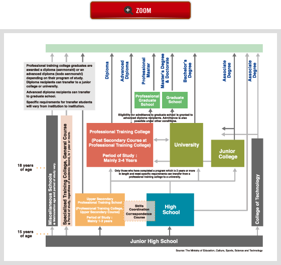 Professional training colleges are accredited post-secondary educational institutions providing professional education for students wishing to pursue professional careers in a number of industries. Together with universities and junior colleges, professional training colleges are one of the core educational institutions delivering post-secondary education in Japan. Professional training colleges typically offer programs ranging in length from 2 – 4 years and award graduates either a diploma (senmonshi) or an advanced diploma (kodo senmonshi). Graduates of professional training colleges can choose to begin their careers upon graduation or continue their studies by transferring to a university or graduate school depending on their program of study and the policies of the accepting institution.